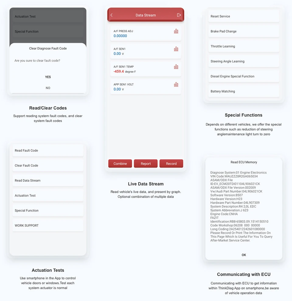 Функции диагностики включают: чтение DTCs, четкие DTCs, чтение datastream, специальные функции и т. Д.;