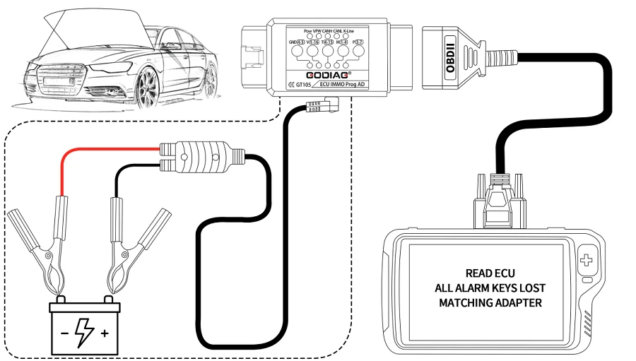 Кабель адаптера питания GT105 получает питание 12 В от автомобильного аккумулятора. (Для программного оборудования, такого как Xhorse Key Tool Plus Pad, VVDI Prog, CGDI Prog, IM608 и т. д., он обеспечивает источник питания 12 В, когда им требуется питание на открытом воздухе, чтобы прочитать данные о противоугонном ECU BMW BENZ или другом автомобиле ECUs, и, наконец, реализовать на месте техническое обслуживание наружных неисправных транспортных средств. )
